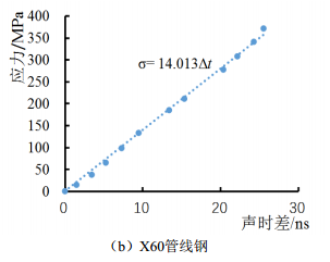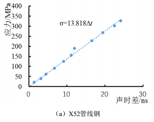 按照公式(2)擬合出應力―聲時(shí)差曲線(xiàn),如圖 4(a)所示, X52管線(xiàn)鋼的應力―聲時(shí)差曲線(xiàn)呈較為嚴格的線(xiàn)性關(guān)系,曲線(xiàn)的公式σ =13.813 ∆t ,則試件(X52管材)應力系數K =13.813 MPa/ns,即表示LCR波傳播時(shí)間每發(fā)生1 ns的變化,代表被測介質(zhì)中就有13.813 MPa的應力變化。同理得到X60,如圖 4(b)、 X70、 X80應力系數。