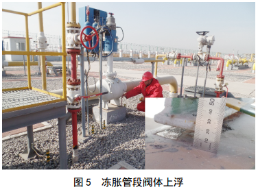 某天然氣分輸站出站口位置管線(xiàn)在低溫下運行,導致管道周?chē)寥纼鼋Y,發(fā)生凍脹現象,埋地管段被抬升,與之連接的臨近地面管段被帶動(dòng)抬升,致使管段閥體離開(kāi)支座(圖 5),管道內部應力增加,安全裕度減小。利用超聲測量裝置對凍脹管段進(jìn)行了測量和評價(jià)(表 1)。