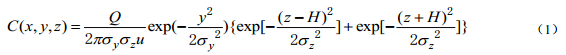 若管道泄漏口為小孔,可認為泄漏為連續泄漏源,采用高斯煙羽模型模擬計算該泄漏氣體的濃度分布,其表達式由式(1)給出: