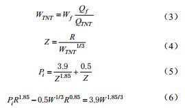 式中: WTNT ,天然氣爆炸事故的當量TNT質(zhì)量, kg; Wf ,參與爆炸的天然氣質(zhì)量,一般取泄漏天然氣質(zhì)量的10%, kg; Qf ,天然氣燃燒熱, J/kg;QTNT , TNT爆炸熱,一般為4.12~4.69 MJ/kg; z , 爆炸特征長(cháng)度; Pi ,爆炸超壓峰值。