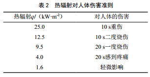 天然氣在開(kāi)始泄漏時(shí)與空氣混合并不完全,如果泄漏口附近有明火,將直接導致天然氣燃燒。燃燒主要危害來(lái)源于燃燒產(chǎn)生的熱輻射,熱輻射可致人體燒傷,使樹(shù)木或其他可燃物發(fā)生燃燒。熱輻射對人體的傷害準則如表 2所示。