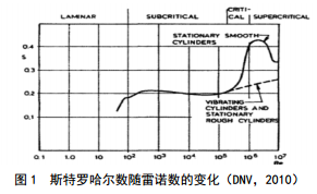 式中: fs為漩渦泄放頻率, Hz; U為波流流速,m/s; D為管道外徑, m; St為斯特羅哈爾數(Strouhalnumber),是流體雷諾數Re的函數(圖 1),對于剛性圓柱體, St一般取0.2;流體雷諾數Re=U×D /v,其 中v為運動(dòng)黏度, m2/s。