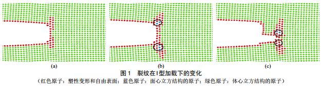 在無(wú)氫原子情況下,裂紋尖端優(yōu)先通過(guò)塑性變形釋放能量(圖 1中紅色原子),并隨著(zhù)應變能持續增加,能量卸載方式會(huì )由塑性變形轉為相變(圖 1中藍色原子為相變原子),而只有當應力強度達到1.45 MPa·m0.5時(shí),相變、塑性變形無(wú)法釋放過(guò)剩的應變能,鈍化的裂紋尖端開(kāi)始產(chǎn)生微觀(guān)裂紋,材料失效。