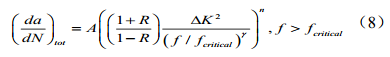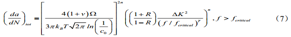 所示[15,16],是經(jīng)驗模型中比較完備且預測準確性較高的模型,然而此模型忽略了 加載頻率對裂紋生長(cháng)的影響存在閾值,而且此模型無(wú)法準確量化外界環(huán)境,特別是溫度對于裂紋生長(cháng)的影響。因此,理論模型的研發(fā)和對微觀(guān)斷裂機理的研究依然是一個(gè)科學(xué)難題。