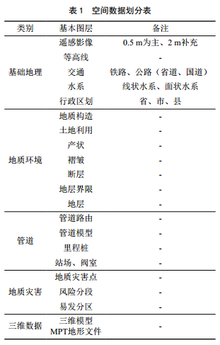 該系統數據類(lèi)別包括空間數據、屬性數據及文件數據,其中空間數據分為基礎地理要素、地質(zhì)環(huán)境要素、管道要素、地質(zhì)災害要素和三維模型五大類(lèi)。屬性數據分為系統元數據、空間矢量數據屬性、文件數據關(guān)聯(lián)數據三大類(lèi),每類(lèi)數據中又對應多個(gè)屬性數據。文件數據分為現場(chǎng)照片、 CAD剖面圖、野外調查表EXCEL、音視頻文件、災害治理相關(guān)文檔及其他以文件方式存儲的數據?臻g數據的構成見(jiàn)表 1。