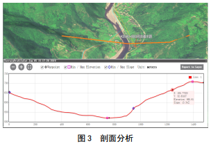 地形剖面分析用來(lái)分析地面上任意點(diǎn)間的坡度和高程情況,分析的結果是繪制出剖面圖。主要實(shí)現如下功能:繪制任意兩點(diǎn)間地形剖面圖;顯示剖面圖中的最大、最小坡度;定位任意一點(diǎn)在三維場(chǎng)景中的位置;顯示起始點(diǎn)的位置與高程信息;調整采樣點(diǎn)間距重新進(jìn)行計算。如圖 3。