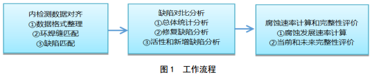 選擇某管道兩次內檢測數據開(kāi)展比對分析,主要工作流程見(jiàn)圖 1。