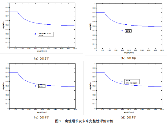 基于腐蝕增長(cháng)速率,對未來(lái)幾年的管道完整性進(jìn)行評價(jià)得到管道剩余壽命,從而安排修復計劃,確定下次內檢測時(shí)間。如某腐蝕缺陷2011年內檢測報告深度為30% wt,經(jīng)過(guò)幾年增長(cháng)到2015年超過(guò)評價(jià)允許尺寸,應在年底前進(jìn)行修復(圖 2)。