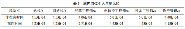 根據站內人員所處位置不同,生成站內風(fēng)險排名,將崗位人員分布中各崗位人員在不同位置的時(shí)間與24 h相除,并乘以各位置的個(gè)人風(fēng)險值,再以崗位為單位進(jìn)行求和,最終得到各崗位人員年度個(gè)人風(fēng)險,見(jiàn)表 3。