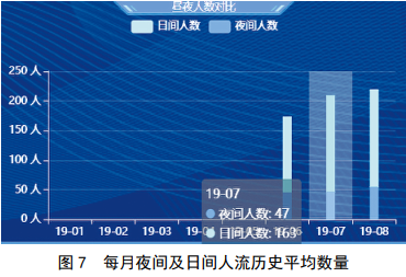 系統利用采集的數據可以提取相關(guān)特征建立專(zhuān)題數據庫,統計分析出年、月、日、時(shí)、分任意時(shí)段內的監視區域內的人員流量歷史平均數據、人員特征畫(huà)像歷史平均數據,同時(shí)利用這些歷史數據,預測分析是否有施工隊進(jìn)駐油氣管道監視周界內,并作出預警提示。圖7、圖8為某成品油管線(xiàn)某高后果區歷史人流統計。