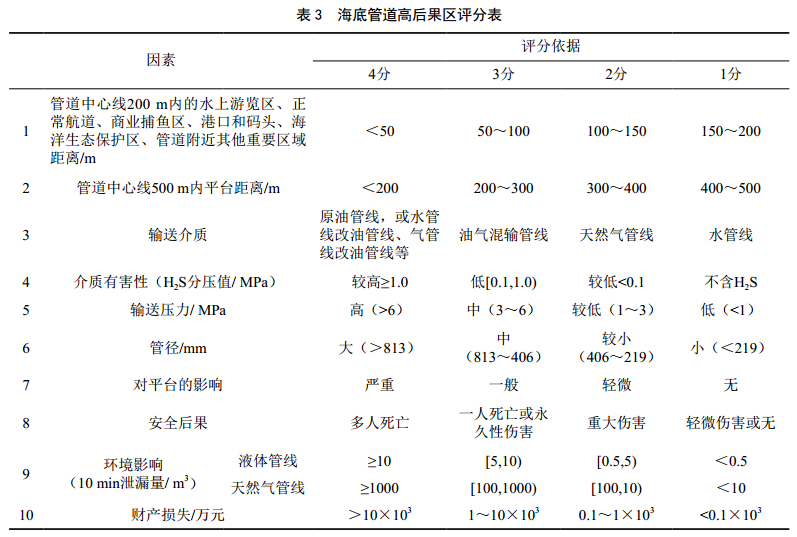 按照表 3進(jìn)行海底管道高后果區分項評分,總分值為15項(表 3內因素1按水上游覽區、正常航道、商業(yè)捕魚(yú)區、港口和碼頭、海洋生態(tài)保護區、管道附近其他重要區域共6項分別評分)評分相加,最高分值為60分。高后果區分值等級,高后果: ≥50.0分;較高后果: 37.5~50.0分;中等后果: 25.0~37.5分;較低后果: 12.5~25.0分;低后果: <12.5分。