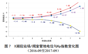 X湖段站場(chǎng)/閥室管地電位與Kp指數變化如圖 7所示,當中間站管地電位偏負屬于電流流入區時(shí),中間閥室和首站管地電位正偏并且屬于電流流出區。當Kp指數增大時(shí),管地電位的波動(dòng)幅度也增大,現場(chǎng)監測到中間站最負電位﹣3.94 V, 3#閥室最正電位﹢1.33 V,首站最正電位﹢2.38 V。