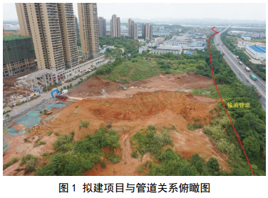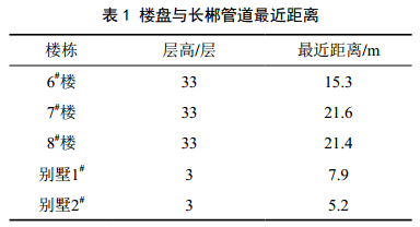 2017年,業(yè)主湖南湘潭永達機械制造有限公司(以下簡(jiǎn)稱(chēng)永達機械)在湘潭市九華經(jīng)濟開(kāi)發(fā)區內籌建高層樓盤(pán)“永達九華府”房產(chǎn)開(kāi)發(fā)項目,總用地面積69 816平方米,土地性質(zhì)為城鎮混合住宅用地(含住宅和商業(yè)),擬居住人口為1 616戶(hù)5 172人。項目位于長(cháng)郴管道K241+600米,管道走向如圖 1所示,與長(cháng)郴管道距離如表 1所示。