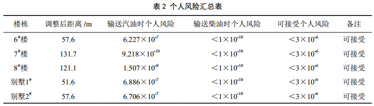 永達機械認真接受政府部門(mén)和專(zhuān)家意見(jiàn),調整了建筑物布局及與管道間距離,并委托湖南安全科學(xué)研究有限公司開(kāi)展管道定量風(fēng)險評價(jià),出具“永達九華府”擬建項目段輸油管線(xiàn)定量風(fēng)險評價(jià)報告。評價(jià)報告認為,經(jīng)調整距離后的“永達九華府”項目區域個(gè)人風(fēng)險和社會(huì )風(fēng)險均可接受,整體風(fēng)險可控。為進(jìn)一步降低風(fēng)險,提出了包括應急措施、安全措施、隱患排查等方面共16條建議[5]。個(gè)人風(fēng)險評價(jià)見(jiàn)表 2。