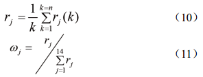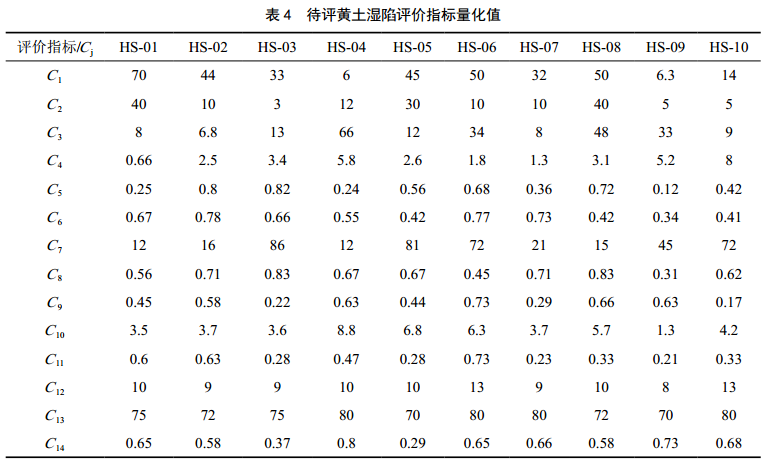 黃土濕陷評價(jià)指標灰色關(guān)聯(lián)度rj由式(10)求得,結果表示為﹛r1, r2,…, r14﹜;利用式(11)計算其權系數ωj。