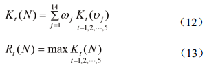 可拓理論引進(jìn)距的概念來(lái)確定關(guān)聯(lián)度,從而將實(shí)變函數點(diǎn)與量值范圍之間的關(guān)系由“類(lèi)內為同”拓展為“類(lèi)內存異”。域內任意一點(diǎn)υj與經(jīng)典域<atj, btj>和節域<apj, bpj>的關(guān)聯(lián)函數Kt(υj)見(jiàn)式(4)。