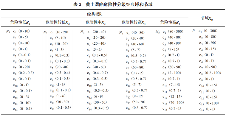 為滿(mǎn)足工程需要,將黃土濕陷危險性劃分為低、較低、中、較高、高5個(gè)等級;依據已有研究及統計成果,其評價(jià)指標可拓分級標準如表 2所示。再據表 2,黃土濕陷危險性分級經(jīng)典域和節域如表 3所示。