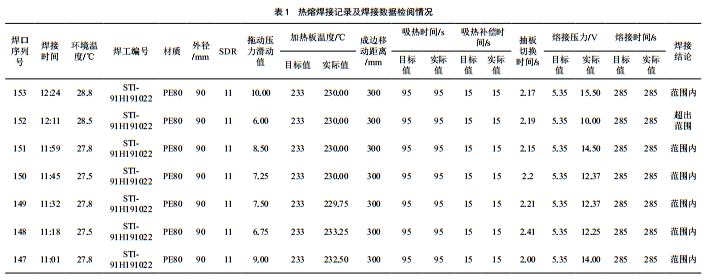 熱熔焊接數據通過(guò)接口傳到TMS系統后,系統首先對焊接數據進(jìn)行解碼,同時(shí)自動(dòng)根據上述公式對Pg進(jìn)行判斷,如超過(guò)目標范圍,則系統提示焊接結果超出范圍。此外,系統還將焊口號、加熱板溫度、抽板切換時(shí)間、加熱時(shí)間、冷卻時(shí)間等參數數字化并在系統中永久保存,以便追溯。如某公司上傳至TMS系統的焊接數據,系統校驗發(fā)現界面凈作用力Pg超出范圍,據此判定該臺熱熔焊機可能存在質(zhì)量問(wèn)題,要求對熔接壓力超標的焊口做進(jìn)一步的外觀(guān)檢查,必要時(shí)做破壞性試驗,并要求使用者及時(shí)聯(lián)系焊機供應商進(jìn)行檢修。表 1為某公司熱熔焊接記錄及焊接數據檢閱情況。