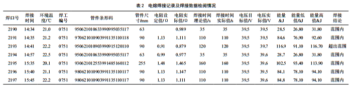 TMS系統中電熔焊接數據是以某管件實(shí)際焊接能量值與管件供應商提供的標準能量范圍相比較進(jìn)行校驗,要求管件供應商通過(guò)大量試驗及結合設計方案確定該管件焊接能量范圍,同時(shí)系統記錄焊口號、焊接電壓、焊接時(shí)間、電阻值等其他焊接參數數字化數據并在系統中永久保存,以便追溯。對于能量超范圍 的焊口要求施工方、監理方著(zhù)重進(jìn)行外觀(guān)檢查,必要 時(shí)進(jìn)行破壞性試驗,同時(shí)也對管件供應商供貨的一致性、焊機性能的穩定性進(jìn)行了復核和校驗。表 2為電熔焊接記錄及焊接數據檢閱情況。