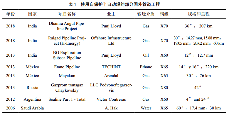 自保護藥芯焊絲半自動(dòng)焊接工藝在印度、泰國、墨西哥、俄羅斯、阿根廷、沙特阿拉伯、伊朗、伊拉克、蘇丹等國家均有應用,表 1為其中部分管道工程信息。
