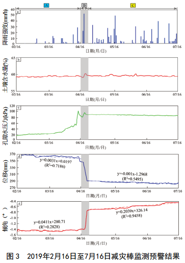 2019年2月16日至7月16日,“減災棒”監測預警系統記錄了降雨量、土壤含水量、孔隙水壓力、斜坡體位移、傾角等參數隨時(shí)間的變化情況,其中以小時(shí)降雨強度、累計降雨量參數代表該區域的降雨情況(圖 3)。