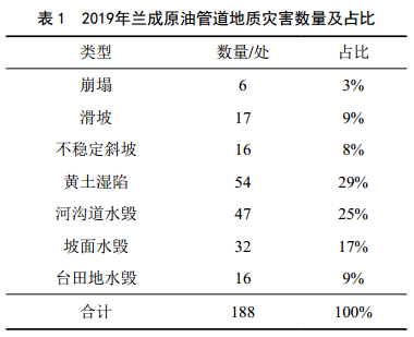 據2019年蘭成原油管道地質(zhì)災害調查資料,甘肅段黃土地區共發(fā)育災害188處,其中黃土濕陷54處,占發(fā)育災害總量的29%(表 1),表明黃土濕陷發(fā)育密集、規模大,易發(fā)性高。黃土濕陷災害由產(chǎn)生到威脅管道安全經(jīng)歷以下過(guò)程。