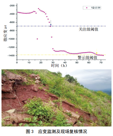 2018年8月13日,平臺監測到中緬管道K321滑坡1#應變監測點(diǎn)應變值出現穩步上升趨勢,抗滑樁出現輕微形變,系統預警。經(jīng)現場(chǎng)復核發(fā)現,持續降雨導致滑坡體第一排抗滑樁左側兩根樁上部管溝處出現小范圍局部滑塌(圖 3);鷧^呈圈椅狀,長(cháng)約15米,寬約8~12米,厚度約1.2米,滑塌區后緣下錯約 1.2米,邊緣下錯約0.4米,局部光纜外露,排水溝堵塞。公司及時(shí)趕赴現場(chǎng)復核,并采取消減措施降低了風(fēng)險。