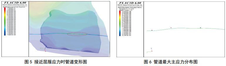 FLAC 3D數值模擬滑坡發(fā)育過(guò)程,在管道應力接近管材屈服應力時(shí)停止計算,得到滑坡整體位移以及位移監測點(diǎn)的數據變化如圖 3、圖 4所示;抡w縱向位移呈現坡度大、位移大的基本規律。由于該滑坡上半部分坡度最大,故最大位移位于滑坡體上半部分,在管道局部應力接近屈服極限時(shí),滑坡體最大縱向位移下降可達8.65 m左右。在該滑坡中部位置,由于地下輸氣管道的存在,阻礙了滑坡土體的下滑,上部下滑土體在此發(fā)生堆積,該位置土體出現了隆起,地表縱向位移最大增加2.2 m左右,與此同時(shí),管道也因此發(fā)生變形,管道應力迅速增加。該滑坡區域布置的三處縱向位移監測點(diǎn)都位于管道上部,在滑坡發(fā)育過(guò)程中,監測數據都先顯著(zhù)減小,然后略微反彈,維持一段平穩狀態(tài),然后監測位移迅速下降;在三處位移監測點(diǎn)中,粉色監測點(diǎn)維持平穩狀態(tài)最久,中間紅色監測點(diǎn)后期縱向位移變化最劇烈。因此在工程實(shí)際中,當三處監測點(diǎn)的位移迅速降低時(shí),需要密切關(guān)注管道安全狀況,對該處滑坡管道采取緊急防護措施,防止管道發(fā)生損壞。