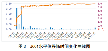 7月15日之后(鋼管樁施工完成之后),每日地表位移量很小, JC01、JC03、JC04平均每日位移量分別為0.027 mm、0.027 mm、0.026 mm,每一個(gè)基礎點(diǎn)都相對穩定,沒(méi)有明顯下滑趨勢。說(shuō)明滑坡體位移數據已經(jīng)趨于收斂,滑坡已經(jīng)趨于穩定。