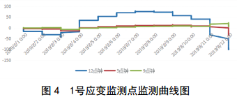 通過(guò)監測數據表明,2019年8月1日后,1號應變監測點(diǎn)和2號應變監測點(diǎn)數據變化不明顯(圖 4、圖 5),各點(diǎn)的整體趨勢基本一致,應變區間為﹣178~78,占極限值的7.73%,未達到關(guān)注級。