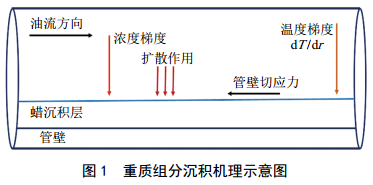 首先需要建立山地管道重質(zhì)組分沉積預測模型。重組分的沉積過(guò)程是多種機理混合作用的結果,其中分子擴散、油流剪切和老化作用對輸油管道中重組分沉積層的形成有較大影響,重質(zhì)組分沉積的物理模型如圖 1所示。