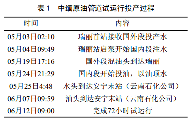 中緬原油管道(國內段)自2017年5月3日瑞麗首站注水,至6月7日油頭到達安寧末站(云南石化公司), 6月12日完成72小時(shí)試運行和相關(guān)測試,管道一次性投產(chǎn)成功,投產(chǎn)總用時(shí)35天。投產(chǎn)過(guò)程詳見(jiàn)表 1。
