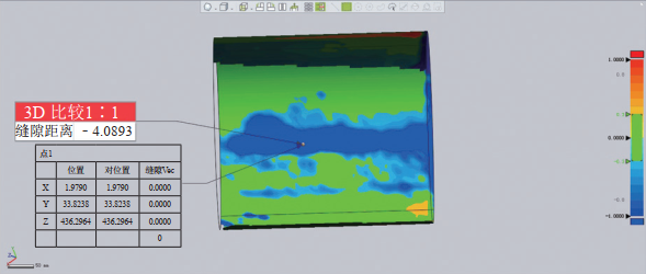 利用三維激光掃描技術(shù)對分割管道內壁進(jìn)行掃描,如圖 2所示。通過(guò)Geomagic軟件對三維形貌模型進(jìn)行處理,結果如圖 3所示。據此可知,現場(chǎng)管道內表面的最大腐蝕深度為4.09 mm,內壁減薄屬于嚴重腐蝕[17]。