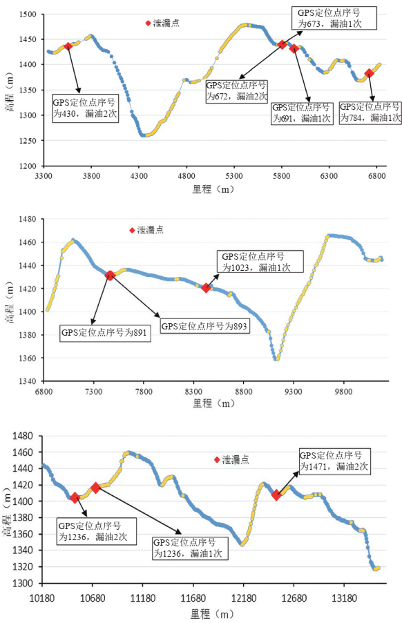 管線(xiàn)閥室之間腐蝕位置預測結果如圖 4所示,圖中黃色管段為易產(chǎn)生積水管段,一般在低洼處及下游上升段內,積水位置與管內介質(zhì)流速及管線(xiàn)有無(wú)停輸有關(guān)。圖中紅色方塊標注了管線(xiàn)歷史腐蝕泄漏位置,與管線(xiàn)腐蝕位置計算結果一致,均為管內易產(chǎn)生積水位置。圖中未發(fā)生腐蝕泄漏但仍是積水腐蝕高風(fēng)險區的管段應加強腐蝕監測工作。參考GB/T 34350―2017 提供的方法,沿管道介質(zhì)輸送方向,從上游向下游檢測排查,預測腐蝕風(fēng)險點(diǎn),重點(diǎn)關(guān)注傾角較大的連續上升區域,具體位置可通過(guò)局部?jì)攘鲌?chǎng)模擬確定。