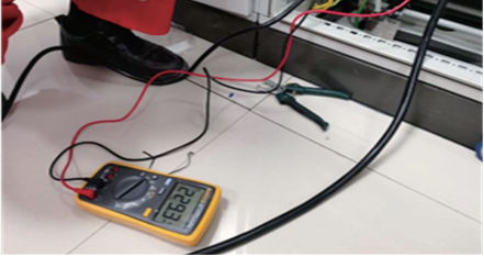 空載試驗即STS輸出端無(wú)負載工況下,將STS輸出端與萬(wàn)用表連接的同時(shí),斷開(kāi)圖 1中UPS線(xiàn)纜即M1進(jìn)線(xiàn),觀(guān)察萬(wàn)用表測量值有無(wú)中斷現象,如圖 2所示。待載試驗即STS輸出端供電PLC本地0#機架工況,斷開(kāi)機架冗余電源模塊中的任意一塊,基于在用電源模塊掉電,控制器實(shí)現主備切換,開(kāi)展UPS掉電STS無(wú)間斷切換市電試驗。