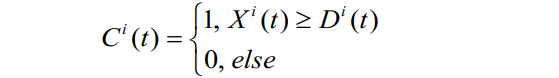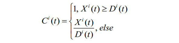 式中,Rigas( j )為第 i 個(gè)需求點(diǎn)、第 j 次模擬時(shí)任務(wù)時(shí)間內的系統可靠度;C i( t )為天然氣管網(wǎng)滿(mǎn)足第 i 個(gè)需求點(diǎn)、第 t 天用氣需求的程度,從氣量維度: