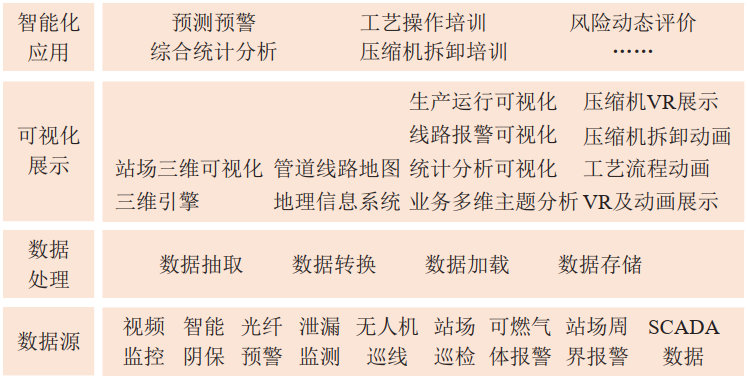 系統集成了中俄東線(xiàn)天然氣管道的多源數據,具體可包括11類(lèi)780多項動(dòng)靜態(tài)數據[3]。數據源可分為三類(lèi):一是站場(chǎng)、設備設施、線(xiàn)路等基礎屬性數據,這部分數據主要是靜態(tài)數據,通過(guò)建設期全數字化移交獲得;二是站場(chǎng)、線(xiàn)路泛在感知數據,包括視頻監控數據、智能陰保數據、光纖泄漏預警數據、站場(chǎng)巡檢數據、可燃氣體報警數據、站場(chǎng)周界報警數據等,這部分數據主要是實(shí)時(shí)動(dòng)態(tài)監測數據,來(lái)源于中俄東線(xiàn)各監測系統;三是生產(chǎn)運行參數,包括運行壓力、溫度、流量、壓縮機運行參數等,這部分數據主要通過(guò)SCADA系統實(shí)時(shí)接入。