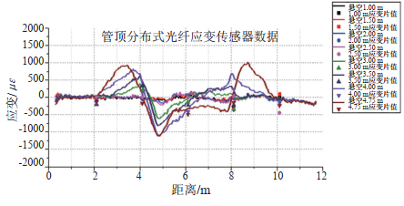 按照圖 2所示的位置將分布式光纖應變傳感器固定在管道上,同時(shí)為了進(jìn)行數據比對,在管道底部增設了1條分布式光纖應變傳感器,共沿管道長(cháng)度方向平行布設了4條分布式光纖傳感器。同時(shí)為了保證光纖監測數據的可靠性,也在模型管道的1/6、1/3、1/2、2/3、5/6長(cháng)度處,在管頂和管底分別等間距布設電阻應變片。在這些位置上,也布置了輕質(zhì)剛性立桿,作為管道關(guān)鍵斷面的變形監測靶點(diǎn),通過(guò)激光全站儀觀(guān)測不同試驗工況下管道的變形狀態(tài)。