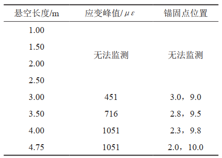 表 2 懸空管道管底應變峰值與兩側錨固點(diǎn)位置