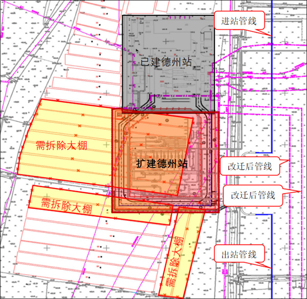 (3)中俄東線(xiàn)(永清—上海)德州站在已建站場(chǎng)基礎上擴建,新場(chǎng)區選址主要為麥地。用地預審調規已按照相關(guān)規定完成,并獲得國家發(fā)改委核準批復。在項目推進(jìn)過(guò)程中發(fā)現站址用地范圍和進(jìn)出站管線(xiàn)路由地面附著(zhù)物已全部為葡萄大棚。為了降低對農業(yè)生產(chǎn)的影響,調整了進(jìn)出站管線(xiàn)方向。如圖 3所示。