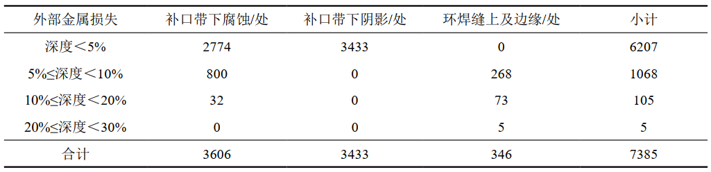陜京一線(xiàn)管道建成投產(chǎn)于1997年,2018年對其中約100公里管道開(kāi)展了第三輪內檢測,發(fā)現補口帶下異常7385處,與上一次檢測相比,補口帶下異常位置明顯增加。對管道補口存在的異常位置和特征進(jìn)行統計,詳見(jiàn)表 1。