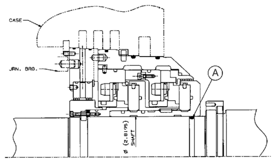(1)故障描述。某機組運行過(guò)程中,巡檢人員在潤滑油箱內檢出高濃度天然氣,此時(shí)機組控制系統無(wú)任何報警信息。通過(guò)對干氣密封進(jìn)行拆檢,發(fā)現軸套與主軸之間O型圈發(fā)生破損造成密封失效(圖 1 A點(diǎn)),高壓工藝氣沿主軸與軸套之間的間隙竄入潤滑油系統,最終在油箱內產(chǎn)生聚積。
