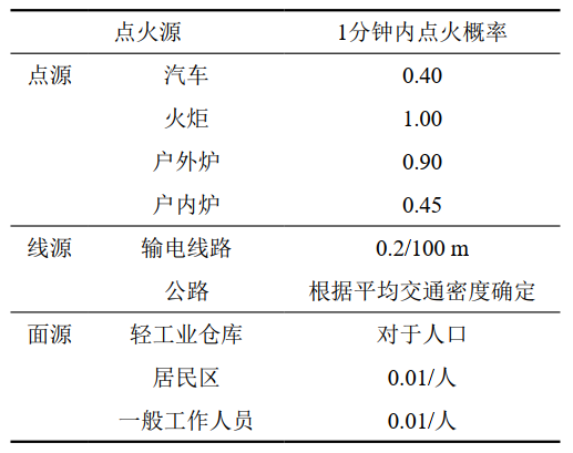 點(diǎn)火概率按一定時(shí)間間隔的點(diǎn)火概率計算,表 4給出了涉及本次特定場(chǎng)所點(diǎn)火源在1分鐘時(shí)間間隔點(diǎn)火的概率。