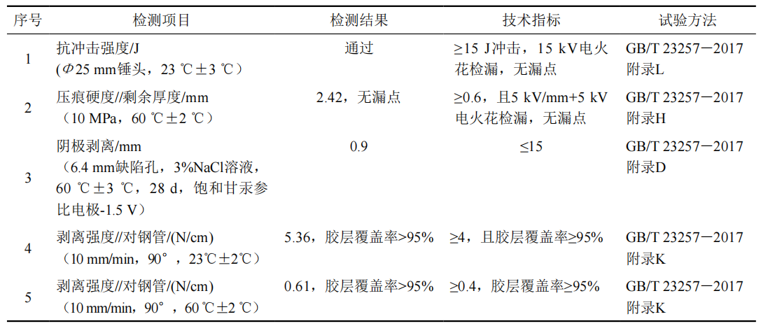 (3)內外防腐層檢測。內防腐層檢測項目及結果見(jiàn)表 3。