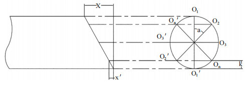 受應力、切割方式等影響,管道切開(kāi)后在垂直或者水平面上表現為斜口,如圖 2所示,可以比較直觀(guān)地看到管口各點(diǎn)的軸向差值與其在測量點(diǎn)所對應的直徑上的投影呈線(xiàn)性關(guān)系。例如測量點(diǎn)O1-O1'的軸向差為x,另有一點(diǎn)On在直徑O1-O1'的投影為k,其所對應的軸向差為kx,也可認為是O1測量值對On的影響。因此,求取O1對On的影響可以轉化為求取On在O1-O1'上的投影。從幾何考慮是一個(gè)簡(jiǎn)單的三角函數,若在劃線(xiàn)時(shí)將管口n等分,則等分角α為360°/n,此時(shí)自下而上各點(diǎn)的系數值為