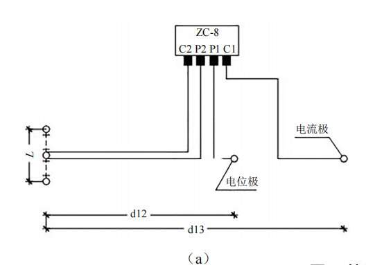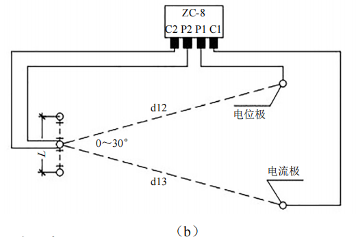 (1)接地電阻測試。采用三角形布極法測量接地系統的接地電阻。如圖 2 a所示,在土壤電阻率較均勻的地區,d13取2 L,d12取L;在土壤電阻率不均勻的地區,d13取3 L,d12取1.7 L(圖 2 b)。測量過(guò)程中電位極沿接地體與電流極的連線(xiàn)移動(dòng)三次,每次移動(dòng)距離為d13的5%左右,若三次測試值接近,取其平均值作為長(cháng)接地體的接地電阻值;若測試值不一致,將電位極往電流極方向移動(dòng),直至測試值接近為止。長(cháng)接地體的接地電阻也可以采用圖 2所示三角形布極法測試,此時(shí) d13= d12≥2 L。