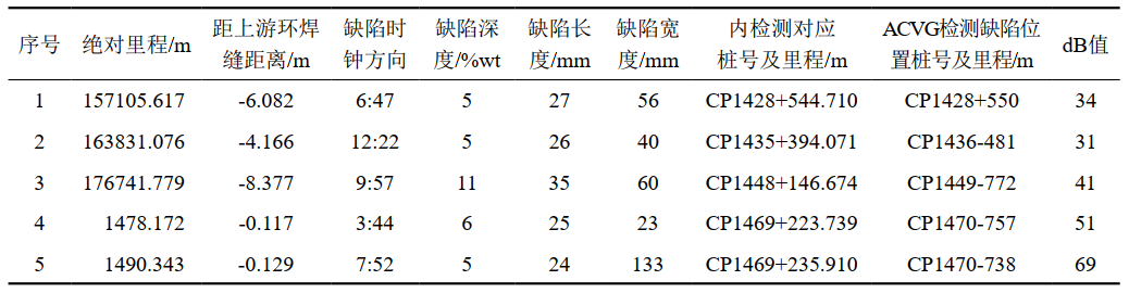 針對梳理的19處外部金屬損失缺陷點(diǎn),開(kāi)展ACVG防腐層地面檢漏,發(fā)現5處防腐層缺陷點(diǎn)與內檢測里程位置一致,詳見(jiàn)表 2。
