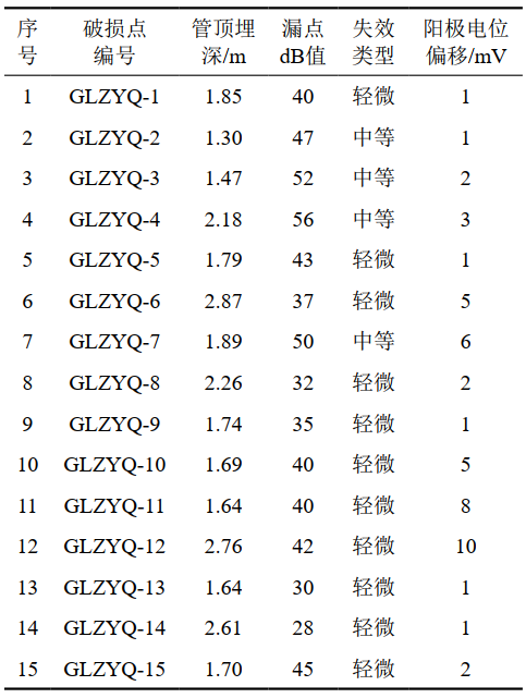 表 1 防腐層破損點(diǎn)對應陽(yáng)極場(chǎng)電位正向偏移統計表