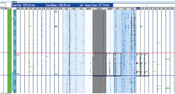 (5)如果反射信號出現在閘門(mén)位中間,可能是坡口未熔合,通常信號連續、波幅較大、有一定長(cháng)度。如果鈍邊通道也能觀(guān)察到相關(guān)信號顯示,則可能是根部斷弧、根部未熔合、根部裂紋、錯邊等等。如圖 4紅藍線(xiàn)之間,從帶狀圖閘門(mén)位置和根部體積通道很明顯看出這是一個(gè)根部未熔合缺陷。