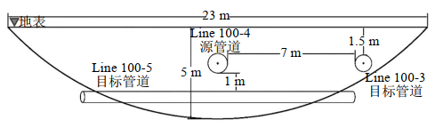 事故現場(chǎng)共有6條管線(xiàn)(Line 100-1~6號)并行,按規定1~4號線(xiàn)的水平間距分別為9.1 m,但3號線(xiàn)和4號線(xiàn)之間的水平間距卻降低為7.0 m,低于公司企業(yè)標準。5號線(xiàn)從1、2、3、4號線(xiàn)下方穿過(guò),頂部與4條管線(xiàn)底部之間的間距0.8 m~1.7 m,符合CSA標準要求。事故源管道和目標管道的空間位置關(guān)系如圖 1所示。
